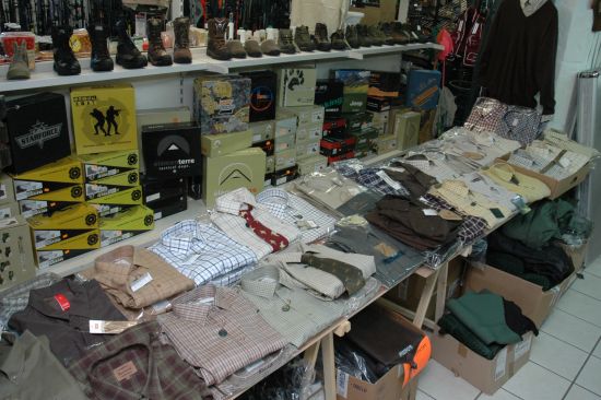 Nombreux modèles de chemises, pulls, vestes de chasse exposées.
