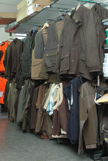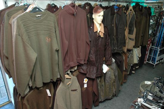 Nombreux modèles de chemises, pulls, vestes de chasse exposées.